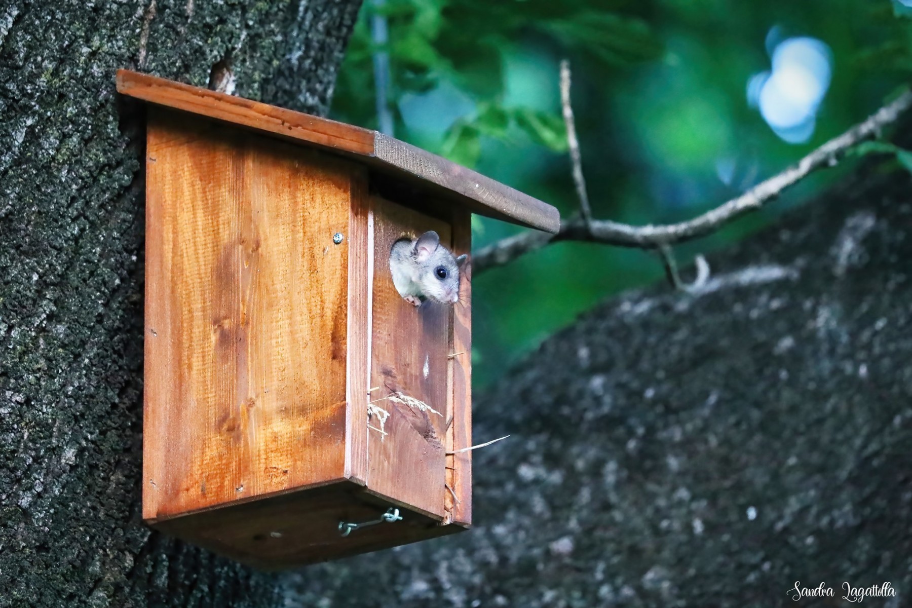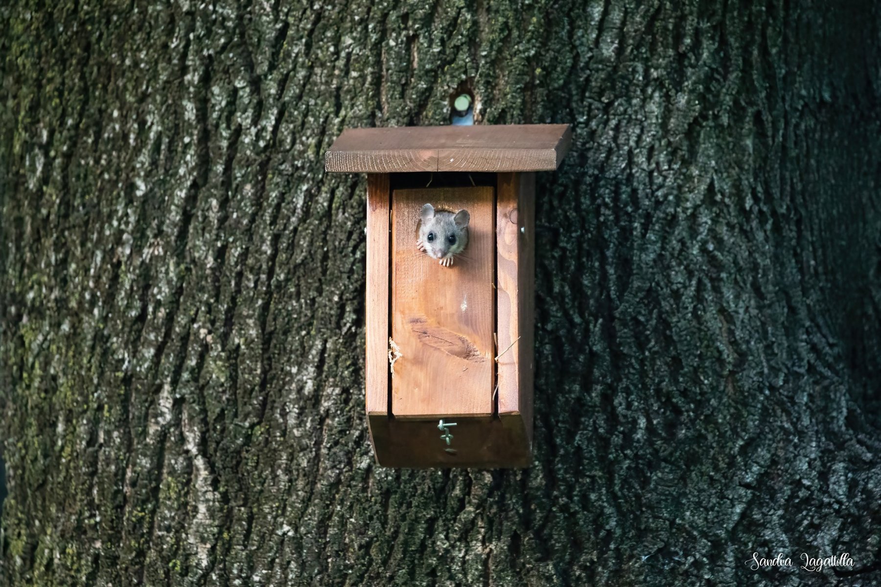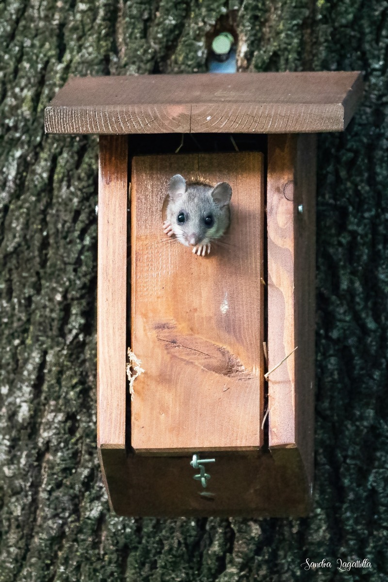 Rientrando da una passeggiata estiva serale dopo il tramonto a un certo punto mi ero sentita osservata e per mia grande sorpresa ho visto questo ghiro guardare fuori da una cassetta nido della Ficedula. Non ne avevo mai visto uno e perciò la mia gioia era doppia. Sono animali notturni e ho scoperto che non è raro che occupano delle cassette nido. In Ticino sono protetti.